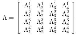 Podemos representar cada uno de los componentes de esta matriz Lorentziana con notación mixta, utilizando un super-índice para designar el renglón al que pertenece el elemento y un sub-índice para designar a la columna: