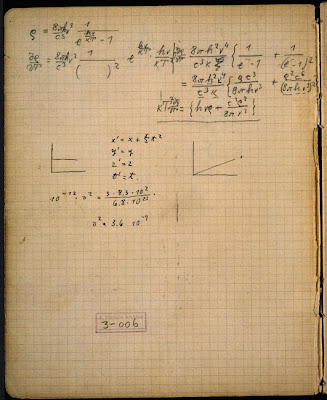 Por la manera en la cual fueron puestos los apuntos, aquí se vuelve necesario voltear el cuaderno de apuntes comenzando desde el otro lado, en donde encontramos una serie de páginas con computaciones llevadas a cabo sobre la física estadística térmica de la radiación del calor (la radiación del cuerpo negro), siendo la primera página la siguiente: